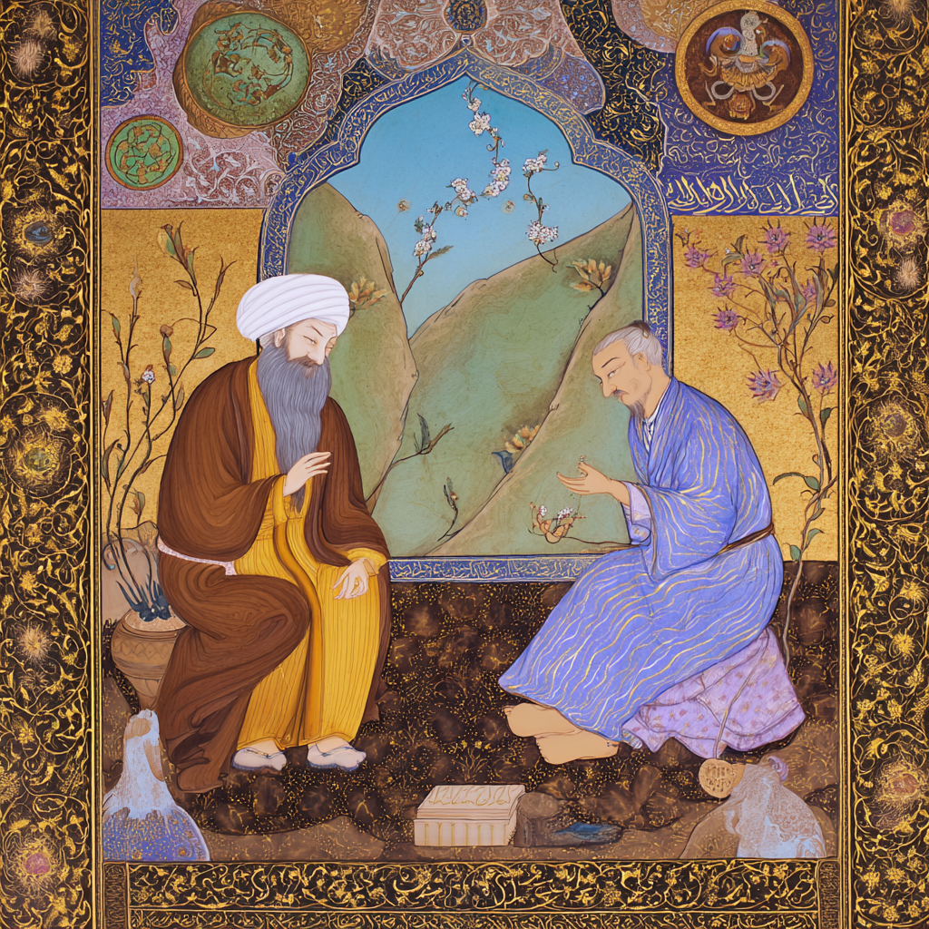 full color spiritual master rumi receiving teachings from shams of tabriz in classic persian style
