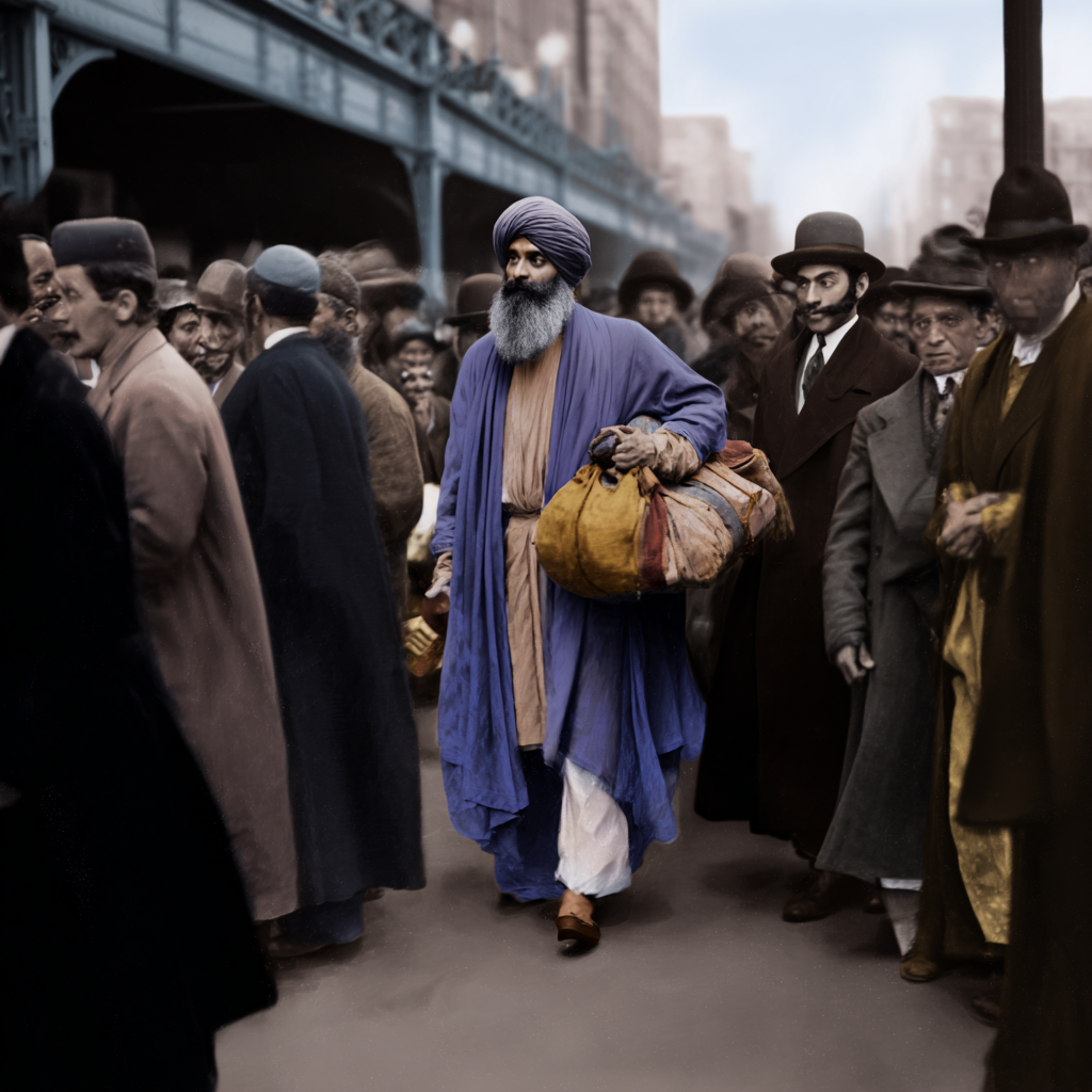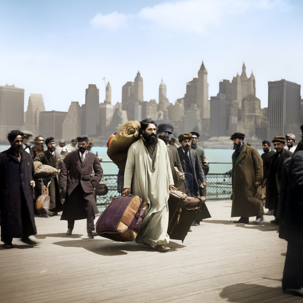 photorealistic view of hazrat inayat khan arriving in new york city in 1910 to begin his bringing sufism to the Western nations