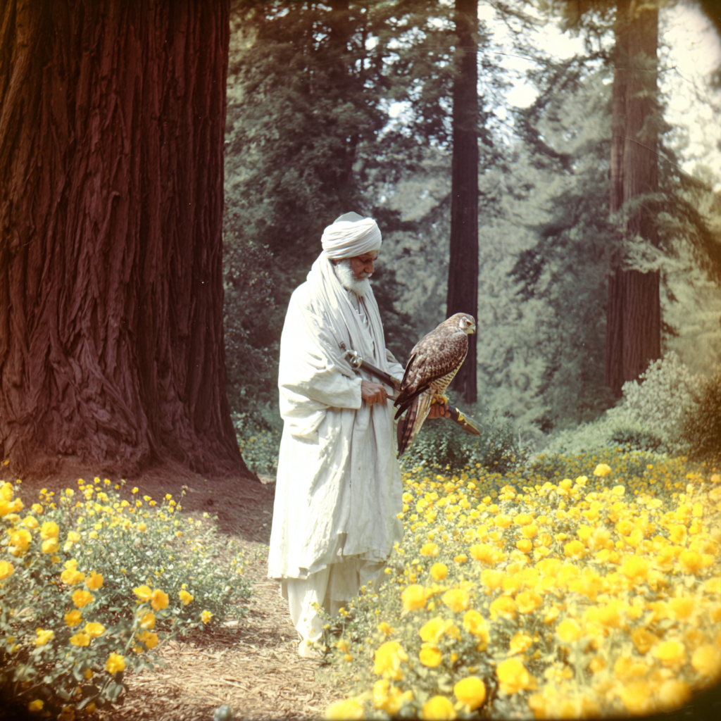 image of vilayat inayat khan at age 50 practicing falconry in a glade of yellow roses with redwood forest in background